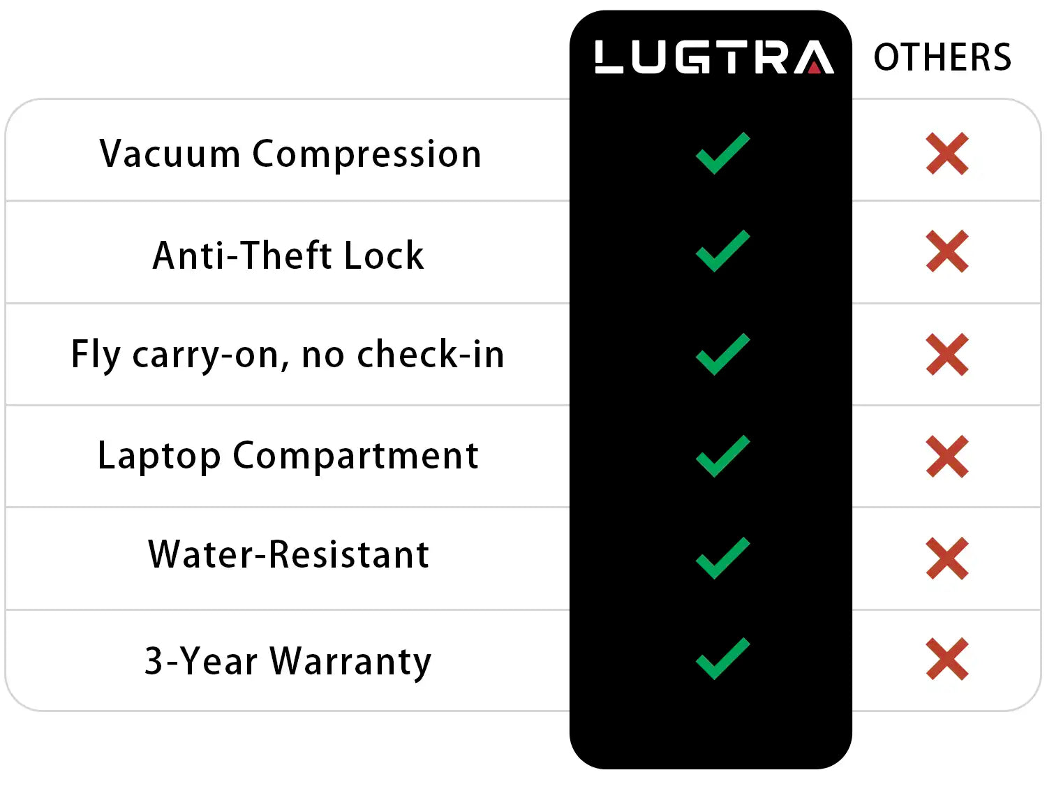 We’ve received thousands of messages from travelers around the world recommending our LUGTRA®. Let’s see how we stand out compared to other brands.