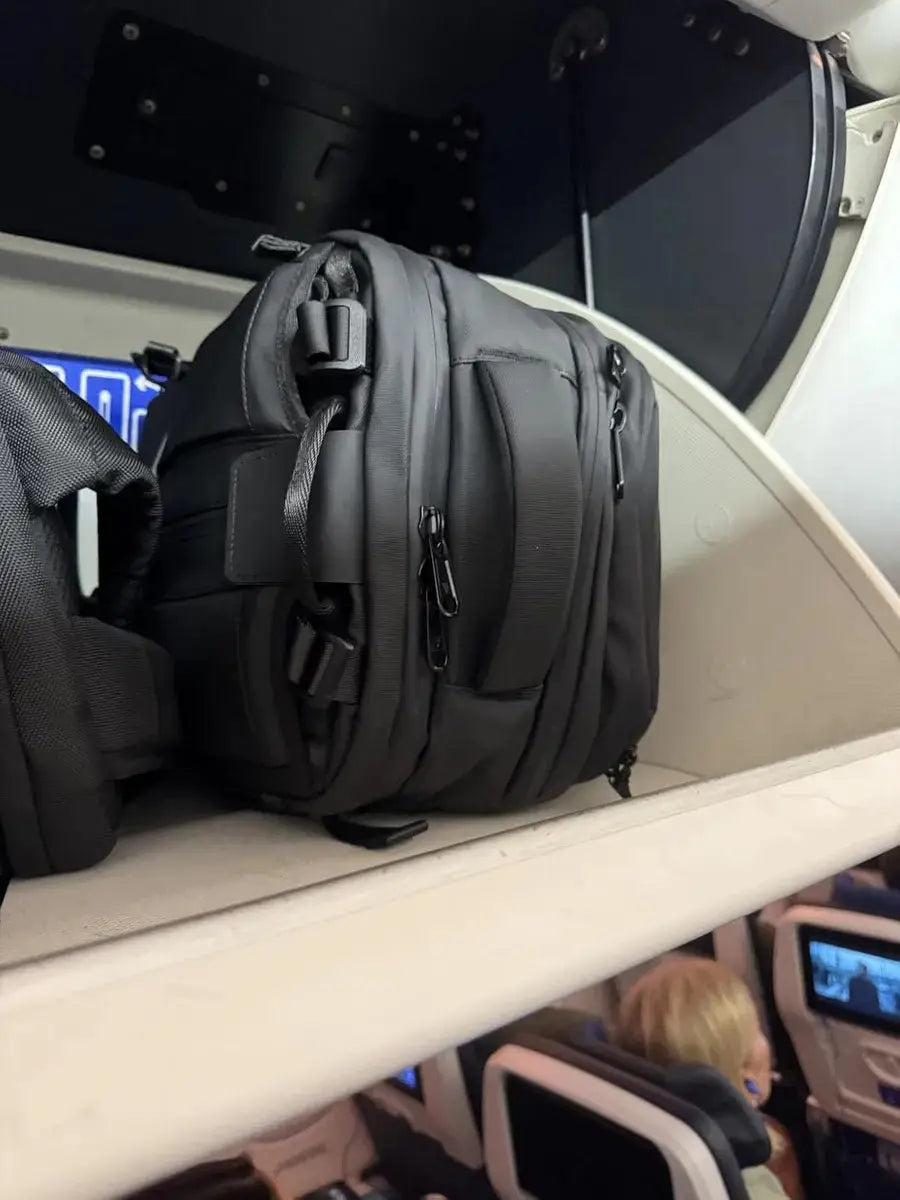 • The bag fits easily in the overhead bin without any struggle. It’s compact but still holds a lot, really convenient for flying.