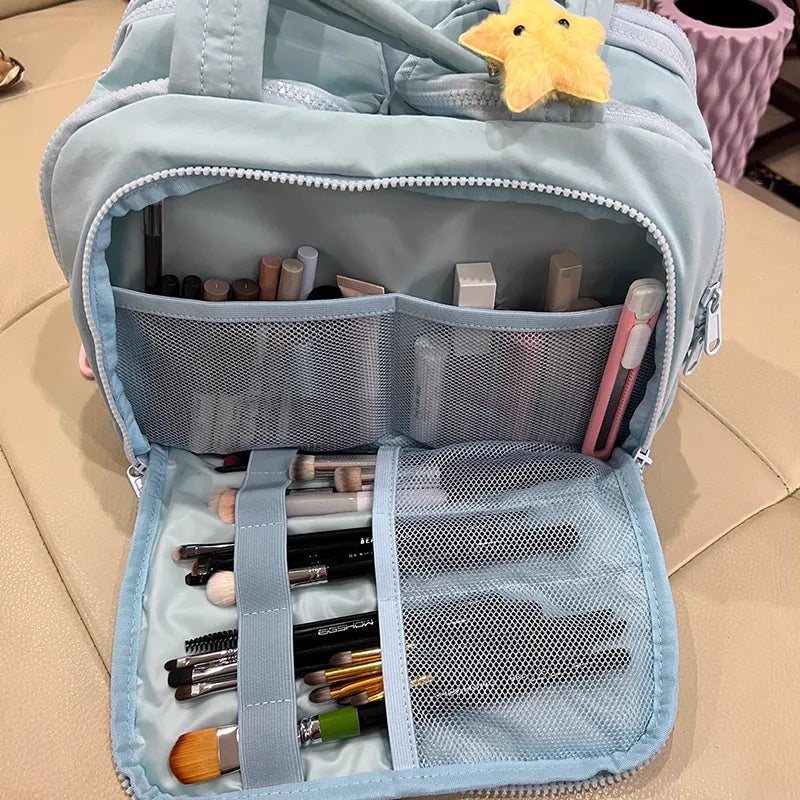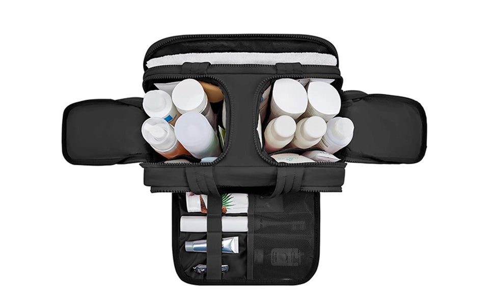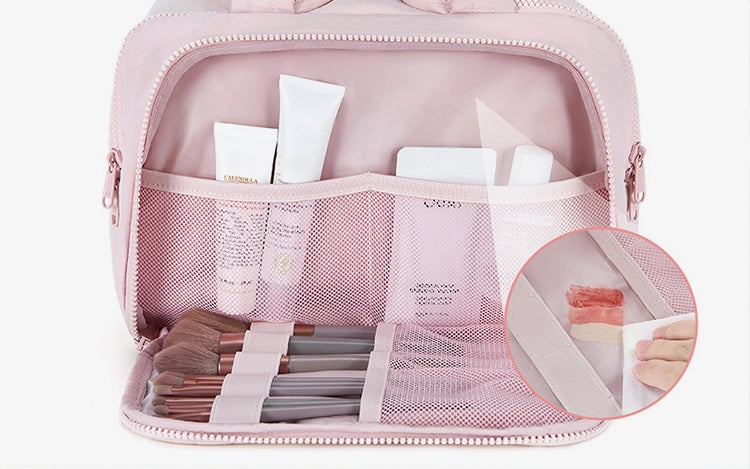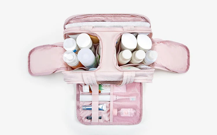 The bag features 4 spacious compartments — two main areas and two zippered pockets — with dedicated slots for brushes, bottles, and more.